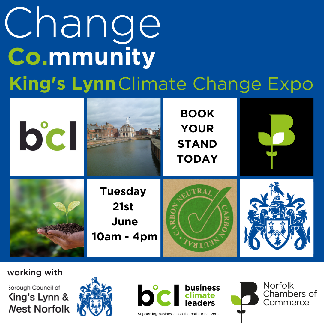 It’s all hands on deck as we Co.llaborate with the Borough Council of King’s Lynn and West Norfolk to help them, help and support local West Norfolk businesses on their net-zero journey. We’re working with their incredible team to launch, share and showcase their upcoming King’s Lynn Climate Change Expo on Tuesday, 21st  June at the Corn Exchange, King’s Lynn. The Climate Expo is a day-long event for not only, businesses but the whole Co.mmunity, with workshops and stands to visit, and it’s free to attend – now is the time to get involved and get Co.nnected with climate change.