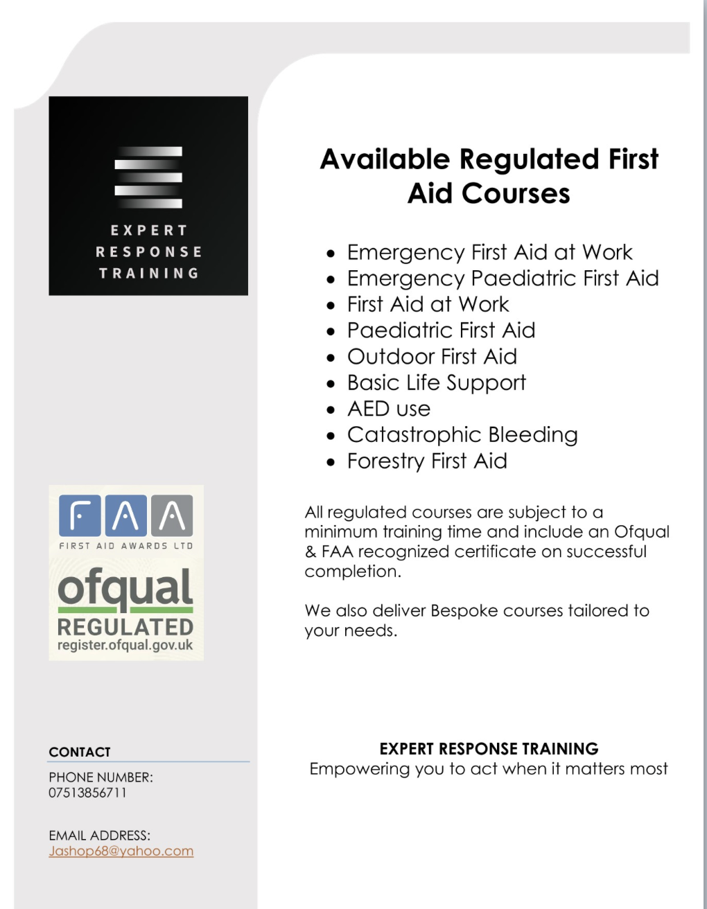 Expert Response Training provides regulated and bespoke training in First Aid and Health & Safety for companies and individuals.