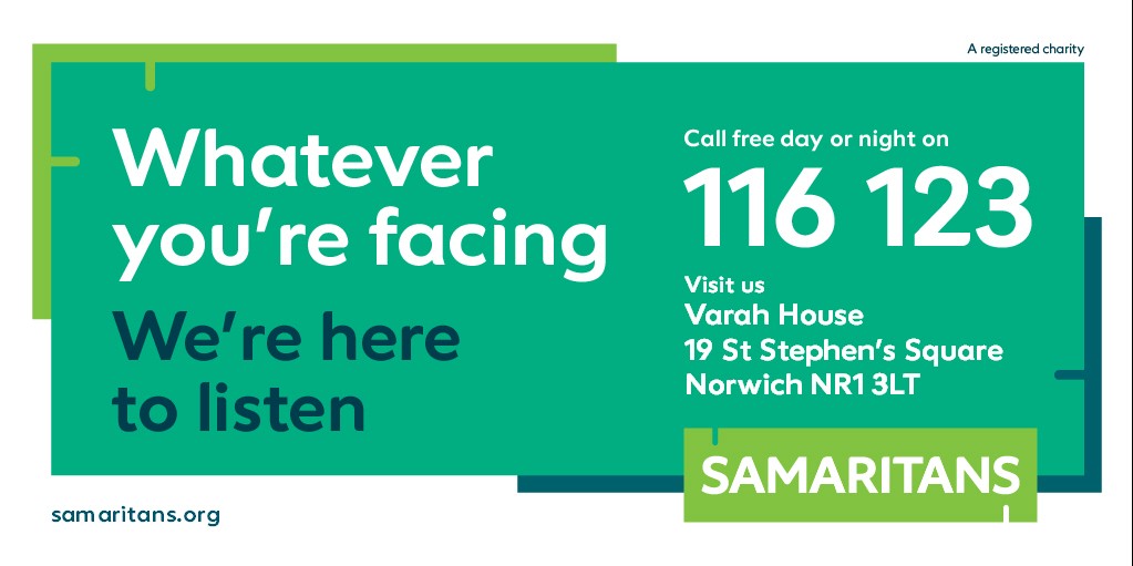 Norwich Samaritans offer free, confidential, non-judgement emotional support 24/7 to people who are struggling to cope.