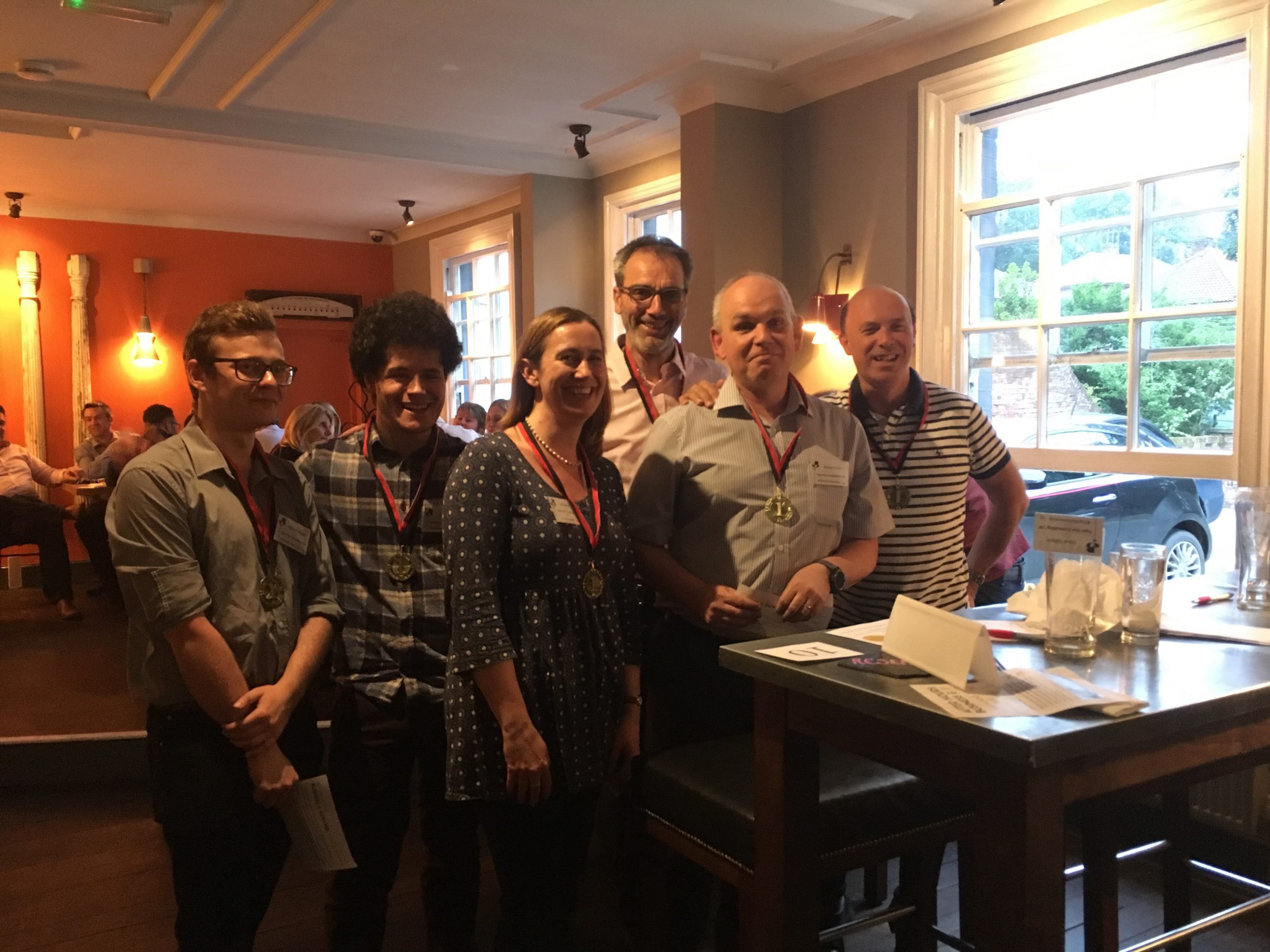 On Thursday 31 May we took over The Earlham Arms on Earlham Road, Norwich, to deliver a knowledge testing evening of informal networking and team building. Over 80 attendees joined us at our annual quiz to make 14 determined teams all competing for bragging rights of being the Norfolk Chamber Pub Quiz winners. The evening of quizzing was made up by 6 rounds, including two table top rounds. Norfolk Chamber staff took part by writing rounds for the quiz, and coming along for the evening to present their questions. As delegates arrived the drinks started flowing and they began work on their first table top round, naming the companies behind famous slogans. When the quiz got started the pub fell quiet as Nova kicked things off with a geography round. The questions were tough for all except team ‘Bills + Thieves’ who scored 9/10! Jack was up next presenting his film and TV round, featuring popular shows such as Breaking Bad, Pokémon and Parks and Recreation. Once the answers were read and scores so far counted, we took a break to enjoy some tapas served by The Earlham Arms. Throughout the break we swapped the table top round to spots questions, asking teams to name famous sporting legends in the images given. When the quizzing resumed Joe gave teams the answers to the table top slogan sheet. This was then followed by Philippa presenting a tough round on arts and culture, featuring plenty of Norfolk based questions to get the teams searching their brains. Up next was the moment we’d all been waiting for; Chris was presenting the music round. Teams heard clips from 10 songs with a word blanked out, they had to guess what the blank word was. To make it easier, all the blanked words were body parts. This round included some singing and interesting dance moves from Chris, and saw ‘Team GGS’, ‘Bills + Thieves’ and ‘Tiger Eye AKA King Quizzard + the Lizard Wizards’ score top marks with 10/10. Jack closed the quizzing by giving the answers to the sports table top round and we collected the final scores. Not only did they have the longest team name in quiz history, but ‘Tiger Eye AKA King Quizzard + the Lizard Wizards’ were also crowned winners with a total score of 54.5 out of a possible 77. They left victorious along with their medals, some chocolates and free tickets to our bowling night. You can see the full scoreboard from the evening below: Position: Team Name: Score: 1st Tiger Eye AKA King Quizzard + the Lizard Wizards 54.5 2nd Bills + Thieves 52 3rd Team GGS 50 3rd If you know the answer you know the answer 50 4th Mattioli Woods 49.5 5th Liftshare 48.5 6th Always Huge Potential 45.5 7th What Skills Gap! 44 8th Cozens-Hardly Know Anything 43 9th Blame Bailey 42 10th Price Bailey 41.5 11th The gloves are off 39.5 12th Steele the Show 38.5 13th The Hopefuls 35